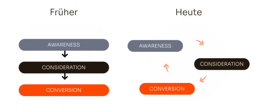 Die Zeiten, in denen Marketingkampagnen brav dem Trichterprinzip folgten, sind vorbei. Früher war der Funnel eine Einbahnstraße: Awareness → Consideration → Conversion → Retention.